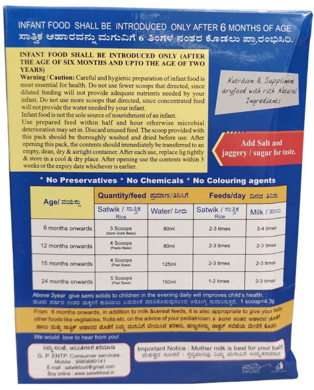 Satwik wheat is the new combination for 6 month after babies, to increase the crawling strength of the baby. It includes centella assiatica to boost thinking process of your baby. It has eight kinds of natural foodgrains to provide all essentialities of 6 month after babies. Taste to eat ! your child will love it.